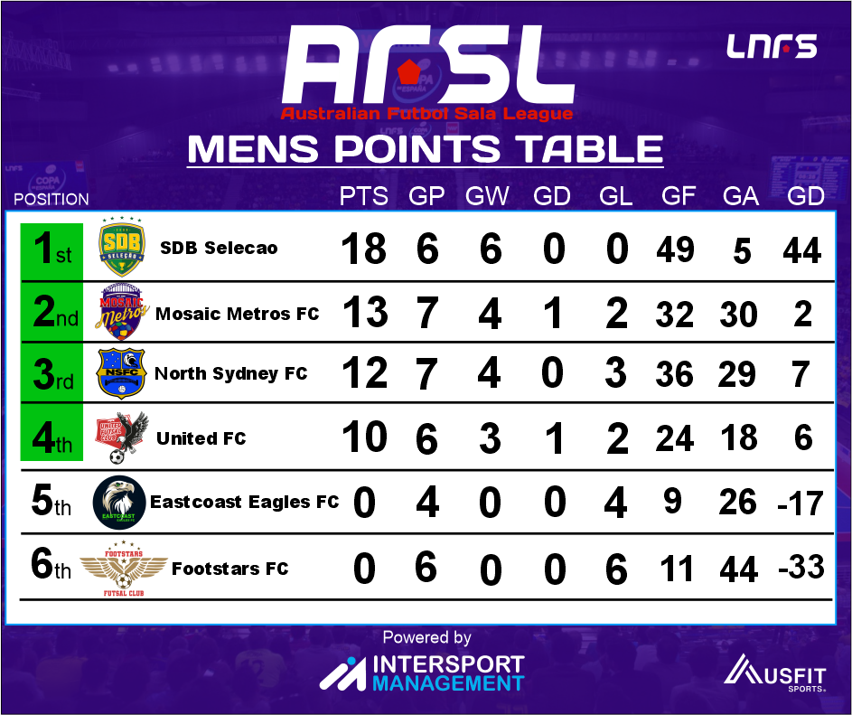 Great news! Mosaic Metros have risen up to second place in the AFSL table after six rounds! While SDB Selecao holds their undefeated position at the top, North Sydney and United FC have fallen to third and fourth place. Eastcoast and Footstars are making progress but still remain at the bottom of the table. Don’t forget to catch all the action on our YouTube channel AFSL_24, and join us as we head to Port Macquarie for the next rounds on Sunday, July 21st!